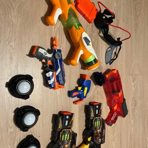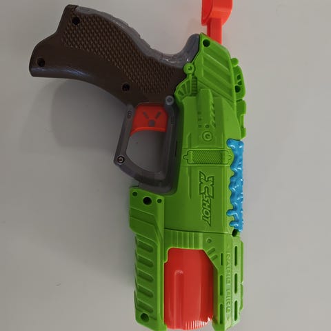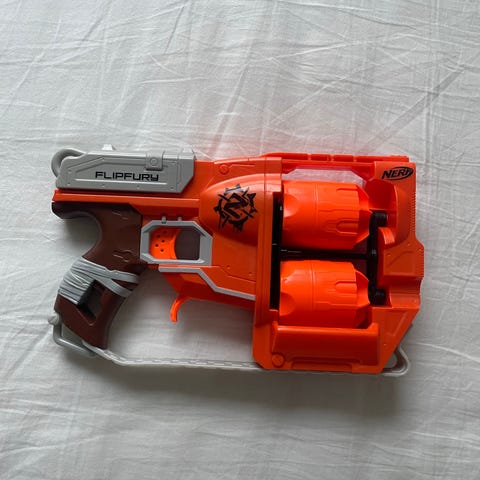 Nerf Zombie Strike Doublestrike blaster med dobbelt tromle til skumskud. Farve: orange og grå. Materiale: plast. Designet til børn og samlere.