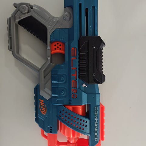 Nerf Elite Disruptor legetøjspistol i blå og orange farver. Fremstillet af plastikmateriale, designet til børn. Modellen har en roterende tromle til opbevaring af skumskiver og en enkelt affyringsmekanisme.