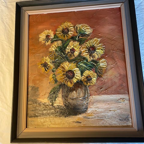 R.G. Ziethen olie maleri med motiv af stilleben, herunder solsikker, frugt og en kande. Maleriet er i en rektangulær ramme og viser detaljerede farver og teksturer i motivet.