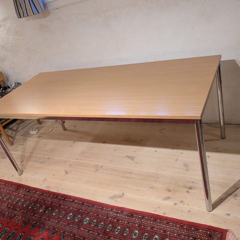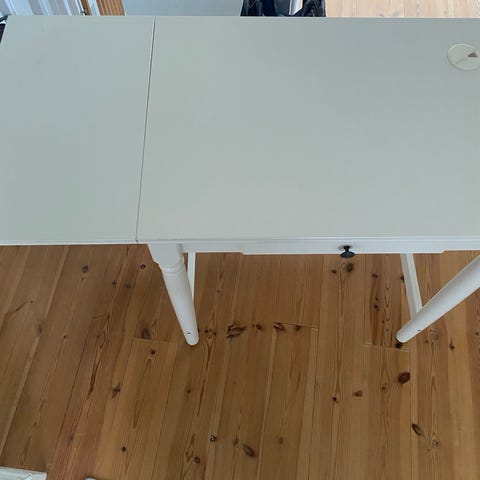Skrivebord med runde hvide indstillige metalben og lys bøgeplade med patina