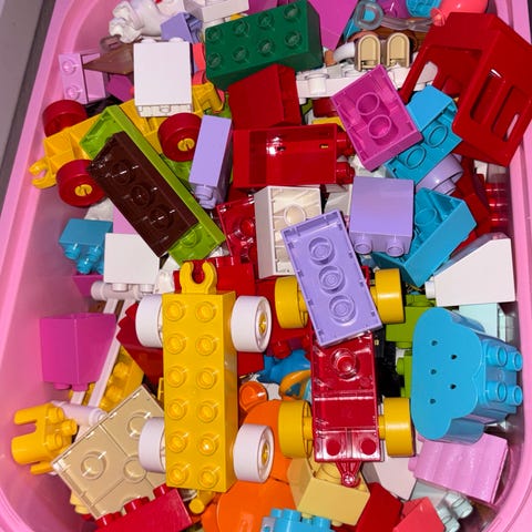 LEGO DUPLO byggeklodser og figurer i forskellige farver og former. Sættet indeholder diverse klodser, køretøjer, dyr og figurer, der kan bruges til kreativ leg og konstruktion. Egnet til små børn til udvikling af motoriske færdigheder og fantasi. Brugt til børnebørn når de har været på besøg, men er blevet for store, så det skal videre. Lukket kasse og ingen brugsspor.