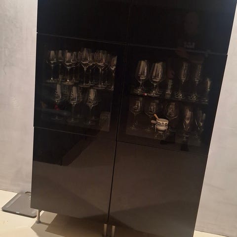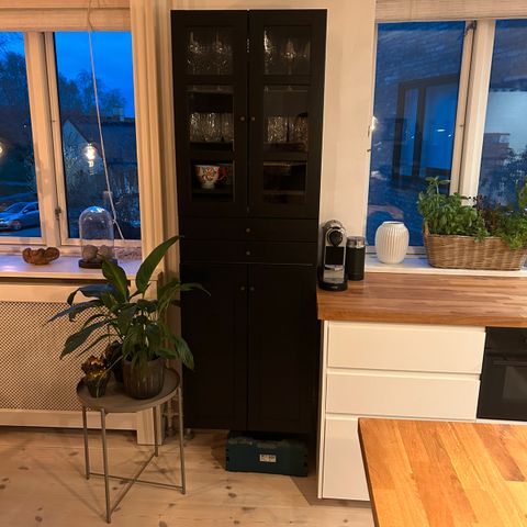 Hvidt med to glaslåger og 4 glashylder. Er i meget god stand uden nogen skader. Kommer med ophængningsbeslag.