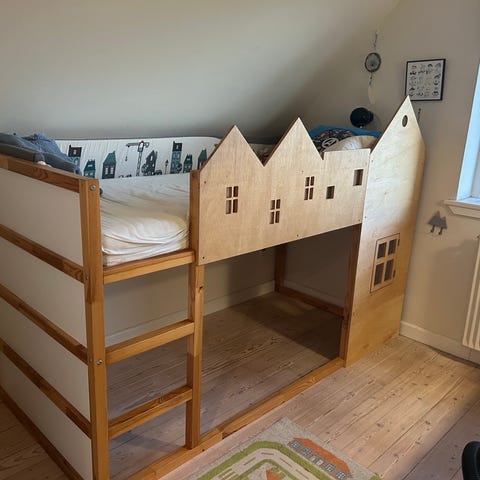 Tilpasset IKEA højseng i træ i fuld størrelse. Den er egnet til at spare plads i børneværelset ved at kombinere soveplads med plads under sengen til opbevaring eller leg.