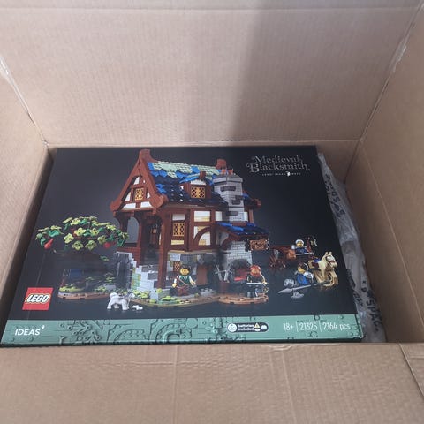 LEGO Ideas Medieval Blacksmith byggesæt med 2164 dele. Sættet indeholder detaljerede figurer og elementer designet til at skabe en middelalderlig smedje. Passer til brug for voksne og samlere.