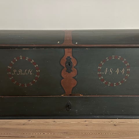 Sjov gammel kasse til bruden. Kassen måler ca. 10x30x50 cm. og er i finer. Stoffet trænger til at blive skiftet. Messingskilt uden på kassen. Kassen har brugsspor som følge af alder, men generelt i pæn stand. Tænker den kan være sjov til hemmeligheder til bruden.