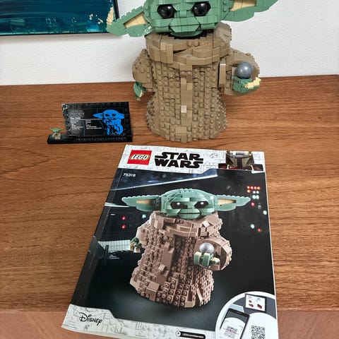 LEGO Star Wars Baby Yoda figurine assembled from LEGO bricks. The model depicts the character Baby Yoda (Grogu) with detailed features including large ears and a robe. The set includes a small display stand and an accessory held in the figure's hand. Suitable for display or collection.