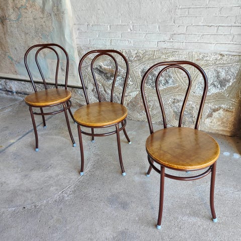 Lidt mærker fra brug, men ellers pæne stole, der passer fint ved et lille bord, da de ikke fylder meget i bredden
