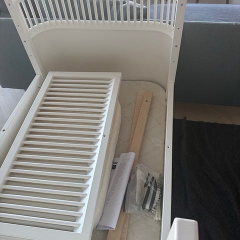 2) En (nyvasket) madras, der er særligt ventilerende og anbefalet for babyer at ligge på. Ekstra (samme) madras til når sengen forlænges.