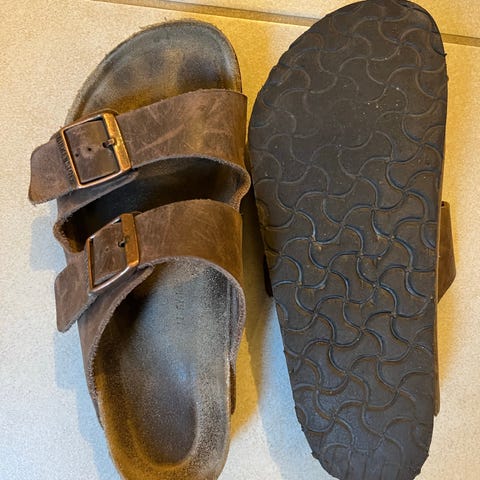 Birkenstock sandaler i størrelse 44 med sorte remme. Sandalerne har en komfortabel fodseng og en slidstærk sål, velegnet til dagligt brug.