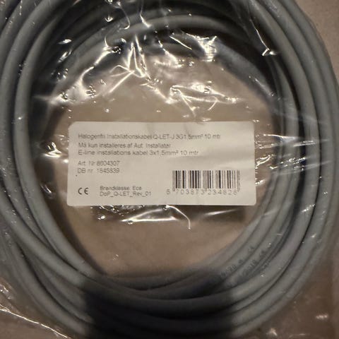 Installationskabel. 750V, 3 ledere med en tværsnitsareal på 1,5 mm², længde: min. 20 meter tilbage. Kabeltypen er egnet til installationer indendørs og udendørs i tørre og våde omgivelser.