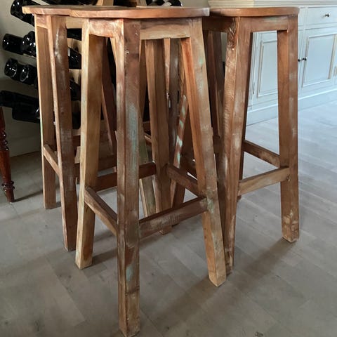 To styk barstole i eg med papirflettet sæder. Købes samlet for 2500 kr. førpris 5000 kr.