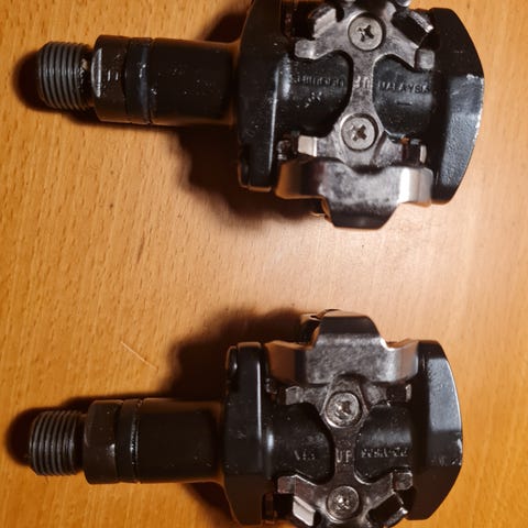 Shimano pedaler i sort aluminium med skruebeslag. Passer til cykler, designet til at give stabil fodfæste under kørsel.