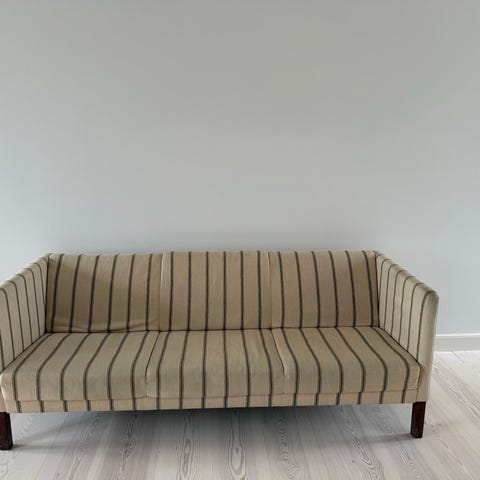 To små fine sofaer i råhvidt heluldent stof. Sælges samlet for 500