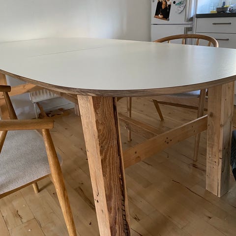 Overfladen er rå mens undersiden er hvid laminat, med huller efter bordben.