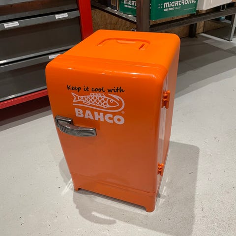 Bahco køleskab med orange farve og retro design. Køleskabet har et enkelt indvendigt rum med hylde i døren. Perfekt til værkstedet