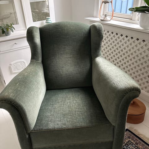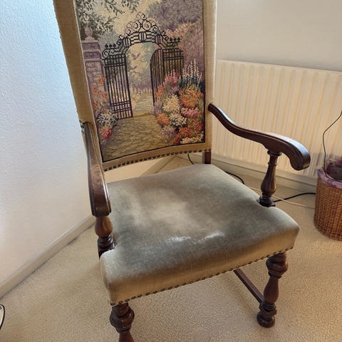 Gammel lænestol i hvidt og grøn stribet stof med mahogni ben.
