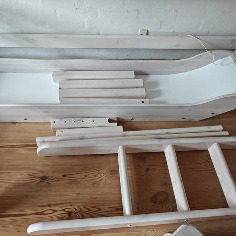Halvhøj seng med lige stige fra Flexa. Massivt fyrretræ/Birke-krydsfinér i hvidpigmenteret træ.