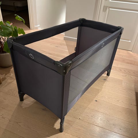 Rejseseng til børn i sort farve med net på siderne for ventilation og synlighed. Madras, bund og transporttaske følger med - alt i fin stand. Egnet til rejsebrug. Let at slå op og klappe sammen. Nem at transportere. Perfekt til overnatning hos bedsteforældre.