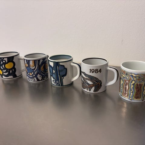 Royal Copenhagen krus med blå og grønne mønstre. Fremstillet i porcelæn med hank. Kruset har et dekorativt mønster. Det er et lille krus med årstal 1971. Højde 7,50 cm. Aldrig været brugt, kun opbevaret til pynt.