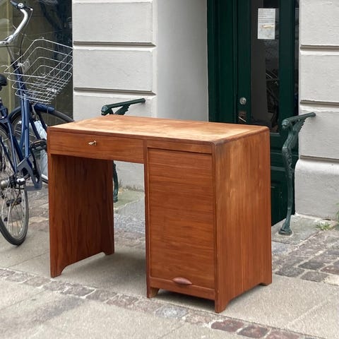 Sekretær skrivebord i træ med rullelåge, flere opbevaringsrum og skuffer. Designet til at fungere som et funktionelt arbejdsbord med plads til dokumenter og kontorartikler. Design a la Wegner. Brugsspor. Se billeder. Hentes på Frederiksberg. Sælges til bedste bud.