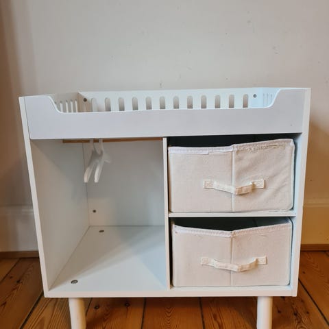 Troll puslebord til børn i hvid. Puslebordet har to hylder til opbevaring og udtræksplade i højre side. Pude og lagner følger med