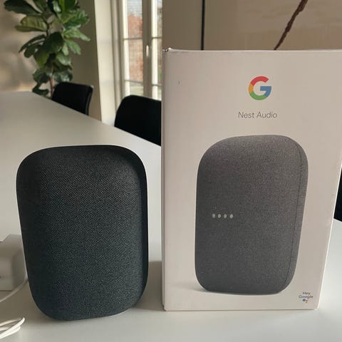 Google Nest Mini smart højttaler med sort stofoverflade. En kompakt enhed designet til stemmestyring og afspilning af musik, podcasts og andre lydindhold via Wi-Fi-forbindelse.