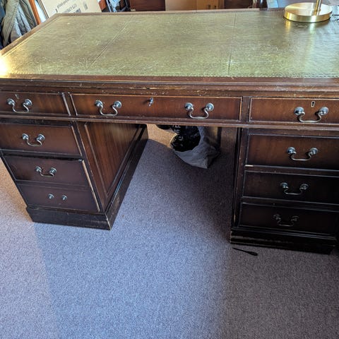 Original greb, grøn læder/skinplade på skrivebord/sybord. Sybord med flere udtræksskuffer med rødt filt.
