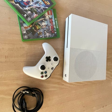 Xbox One spilkonsol med en hvid controller og spillet Halo 5 og fifa 19.