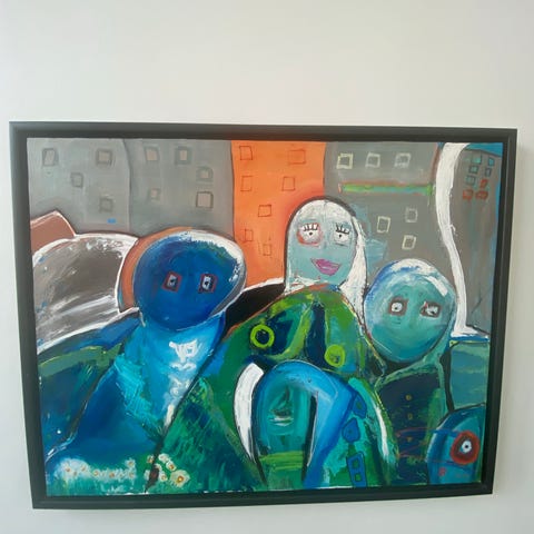 Sæt bestående af 4 kunsttryk med farverige motiver, hver indrammet. Motiverne inkluderer abstrakte og fantasifulde figurer med forskellige farver og temaer. Passer til vægdekoration i hjem eller kontor. Materiale: papirtryk med glasramme.