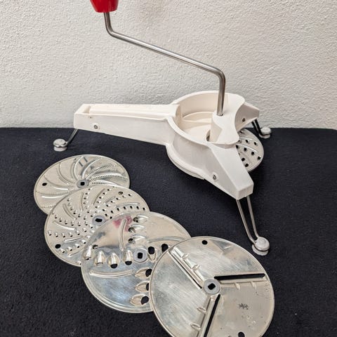 Det gode gamle råkostjern, som altid er super effektivt. Har tilhørt min farmor, så jeg vil mene det er fra halvtredserne, men stadig i perfekt og funktionsdygtig stand. Forbenene kan klappes sammen, så det fylder mindre. Der følger ikke mindre end 5 forskellige rivejern med.