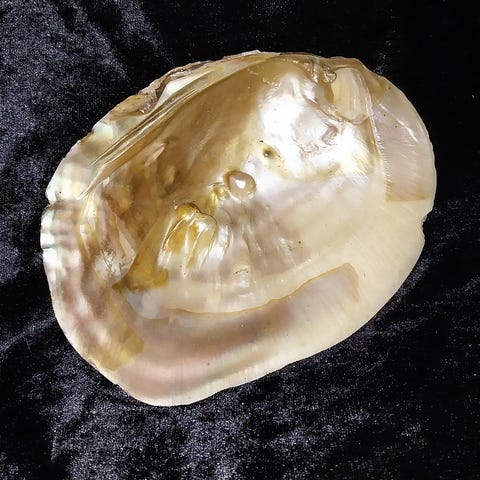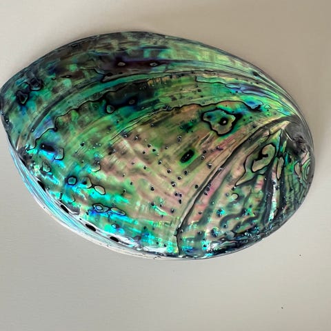 Abeloneskal og perlemusling med naturlig ydre og indre perlemorseffekt. Skallen er ca. 11 cm i længden, med en kombination af beige ydre overflade og flerfarvet, iriserende indre overflade. Velegnet til dekoration eller samling.