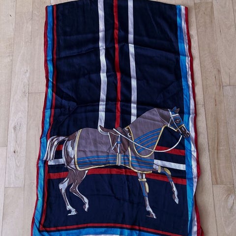 Hestetørklæde 85 x 87, Hvidt & blåt, 100 % Viscose, Ubrugt, Super tilbud. Rundt og dejlig let. Hvidt med mørkeblå heste. Det er så stort, at det kan nå 2 gange rundt om halsen. Helt nyt i cellofanpose. Fås også i blåt med hvide heste.