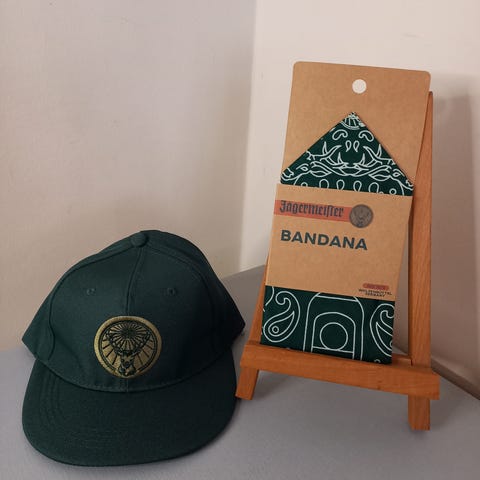 En sej Jägermeister vinterhue. Strik med flot Jägermeister læder-logo syet på huen. Farverne er klassisk Jägermeister mørkegrøn og orange.