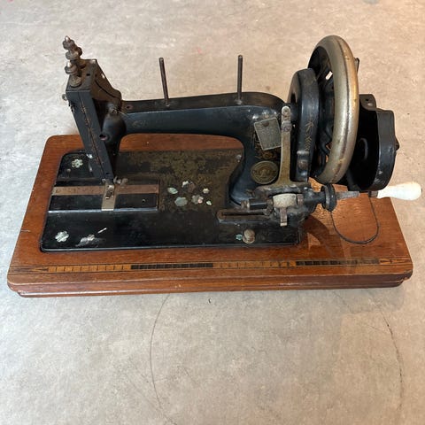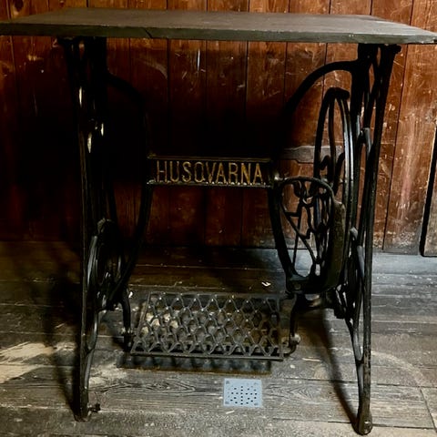 Symaskine arbejdsbord. Standen er god, spor af tid er synlige. Udskiftning af en dækselholder.Afhentning Taastrup