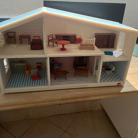 Lundby dukkehus med flere rum og detaljerede møbler, herunder stue, køkken, soveværelse og badeværelse. Se foto for alle figurer og inventar (bemærk ex. rød sofa, barneseng og 2 babysenge)