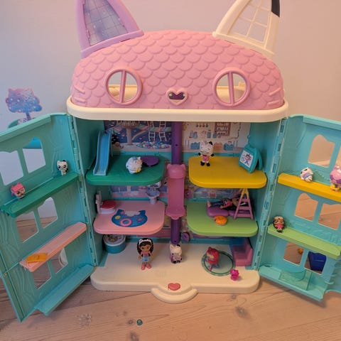 Gabbys purrfect dukkehus i brugt med god stand. Inkl 3 værelser med tilbehør og dukker. Der medfølger også en vandrutsjebane.