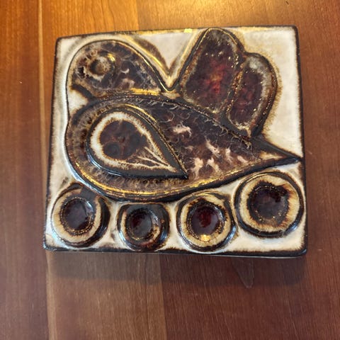 Søholm relief i stentøj fra Søholm, Bornholm, Danmark. Relieffet har motiv af to kirkeugler og er dekoreret med karakteristiske blå og brune glasurer. Serienummer 3502 er stemplet på bagsiden. Reliefet har en højde på 21 cm og fremstår i god stand.