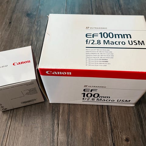 Canon EF 100mm f/2.8L Macro IS USM objektiv med makrofunktion. Objektivet har en brændvidde på 100 mm og en maksimal blænde på f/2.8. Det er designet til makrofotografering og har billedstabilisering (IS) samt ultralydsmotor (USM) for hurtig og stille autofokus.