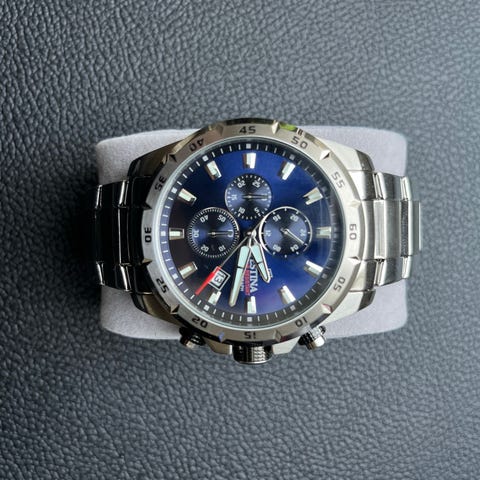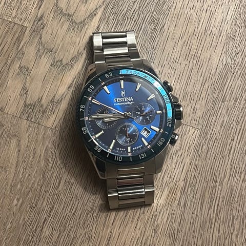 Festina herrearmbåndsur med blå urskive, guldtonet og blå læderrem. Uret har kronograffunktioner og viser dato. Remmen er justerbar med spænde.