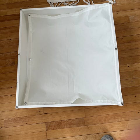 Rattan opbevaringskasse fra Ikea med bomuld låg og lynlås. Römskog sengeskuffe gør det tomme rum under sengen til et praktisk sted at opbevare tøj eller sengetøj.