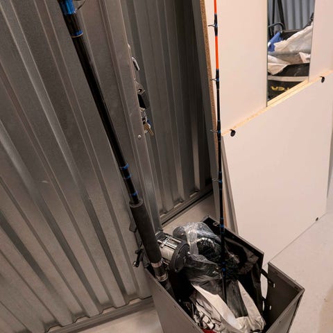 Fish Logic fiskestang med tilbehør. Fiskestangen er sort og leveres med forskellige fiskeredskaber og tilbehør til fiskeri.