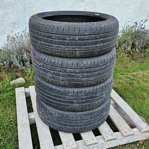 Dækkene er HELT nye, de sad oprindeligt på min fabriksnye Renault Scenic e-tech Electric 87 kWh, som jeg hentede den 1. december 2025. Aldrig været kørt på udover ind i Renault-værkstedet i Albertslund hvor de blev byttet til helårsdæk, da jeg ønsker helårsdæk og ikke sommer- og vinterdæk. Har siden ligget beskyttet indenfor i hus.