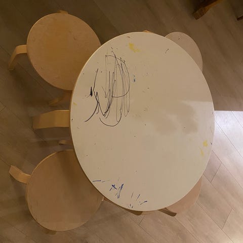 Sæt med bord og to stole “Mads” fra Hoppekids, købt i 2024 for 1.400 kr.
