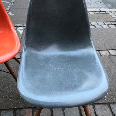 Dette er ægte vintage glasfiberstole med tydeligt fibervæv antageligt produceret i 1960 erne og ikke de nyere plastikudgaver.