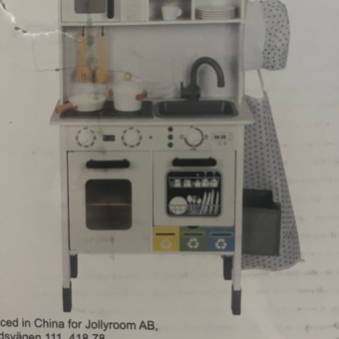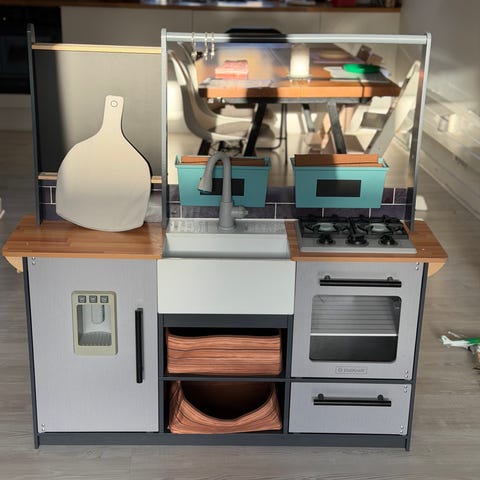 Legekøkken med håndvask, kogeplader, ovn og opbevaring.