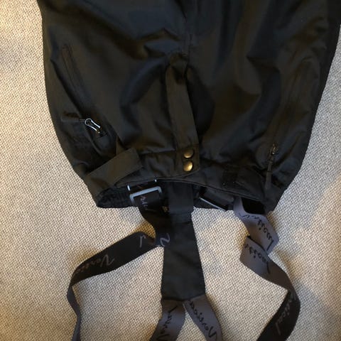 Fine overtræksbukser fra Altitude 8848 med aftagelige seler og bælte samt snefang til at få udenom støvlerne og en lomme foran. Brugt på et par skiferier. Størrelse 150.