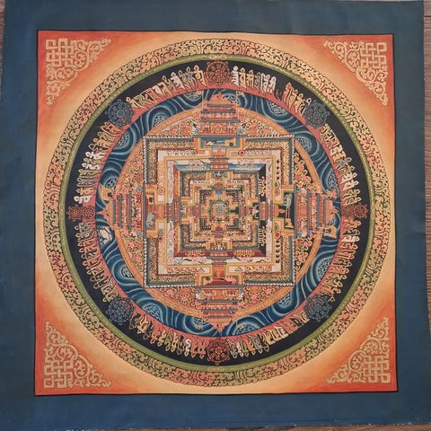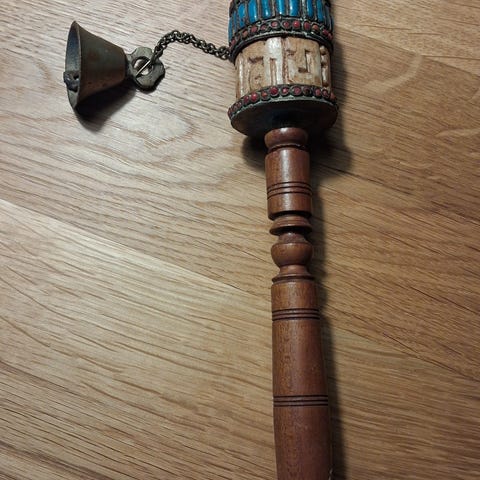Tibetansk bedemølle der indeholder skriftrulle med mantraer. Lille defekt i træhåndtaget.