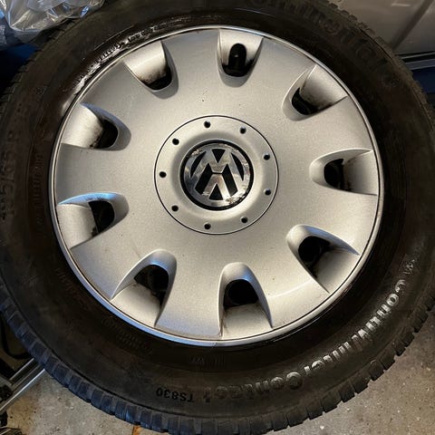 Volkswagen Winter i*cept dæk med fælge, størrelse 195/65 R15. Dækkene er vinterdæk og leveres med originale Volkswagen kapsler. Der er 7 mm mønster. Kom gerne med bud