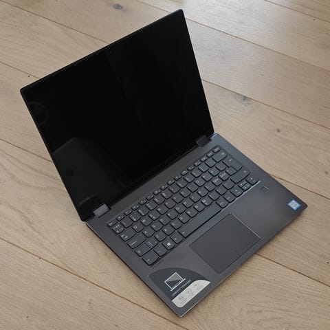 Lenovo Yoga laptop med en grå finish. En bærbar computer designet til alsidig brug med fleksible funktioner. Udstyret med et belyst tastatur og en skærm, der understøtter forskellige arbejds- og underholdningsbehov.