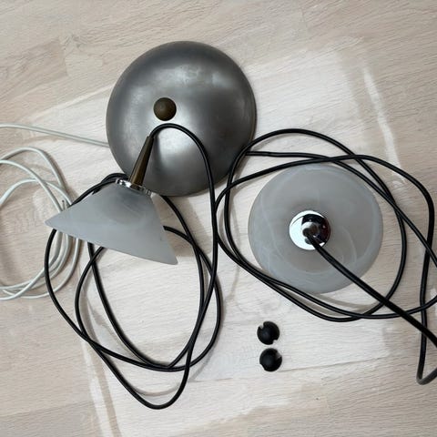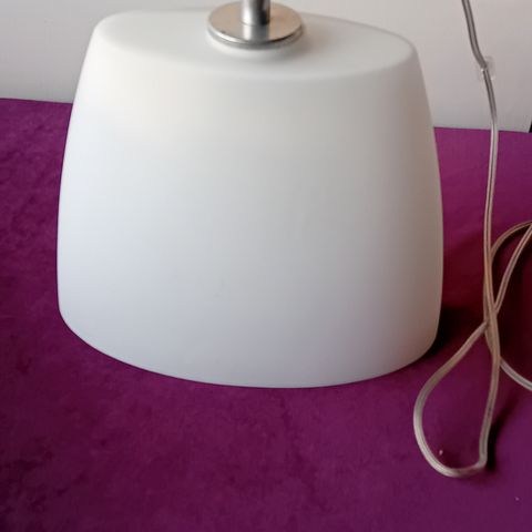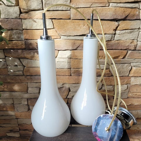2 stk. glas loft lamper i hvid. Lamperne har ingen fejl på og er i god stand. De er 40 cm. høje og 20 cm i bunden (runde).